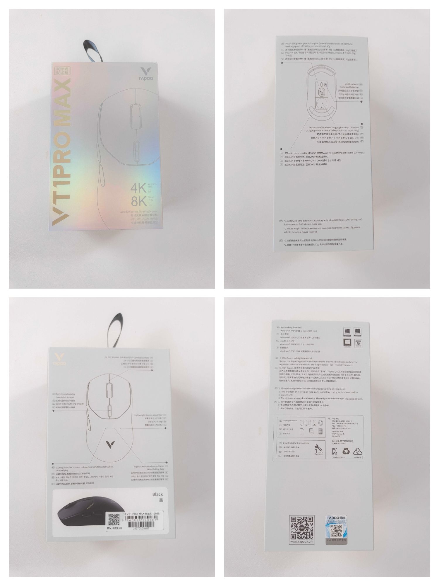 一、外观雷柏VT1 pro max外盒的正面采用的是镭射,不同光线下有不同的燕娥,这让五彩斑斓的白有了具体的样子。其他几面采用的是浅蓝灰,这个颜色很有高级感,我还挺喜欢的。