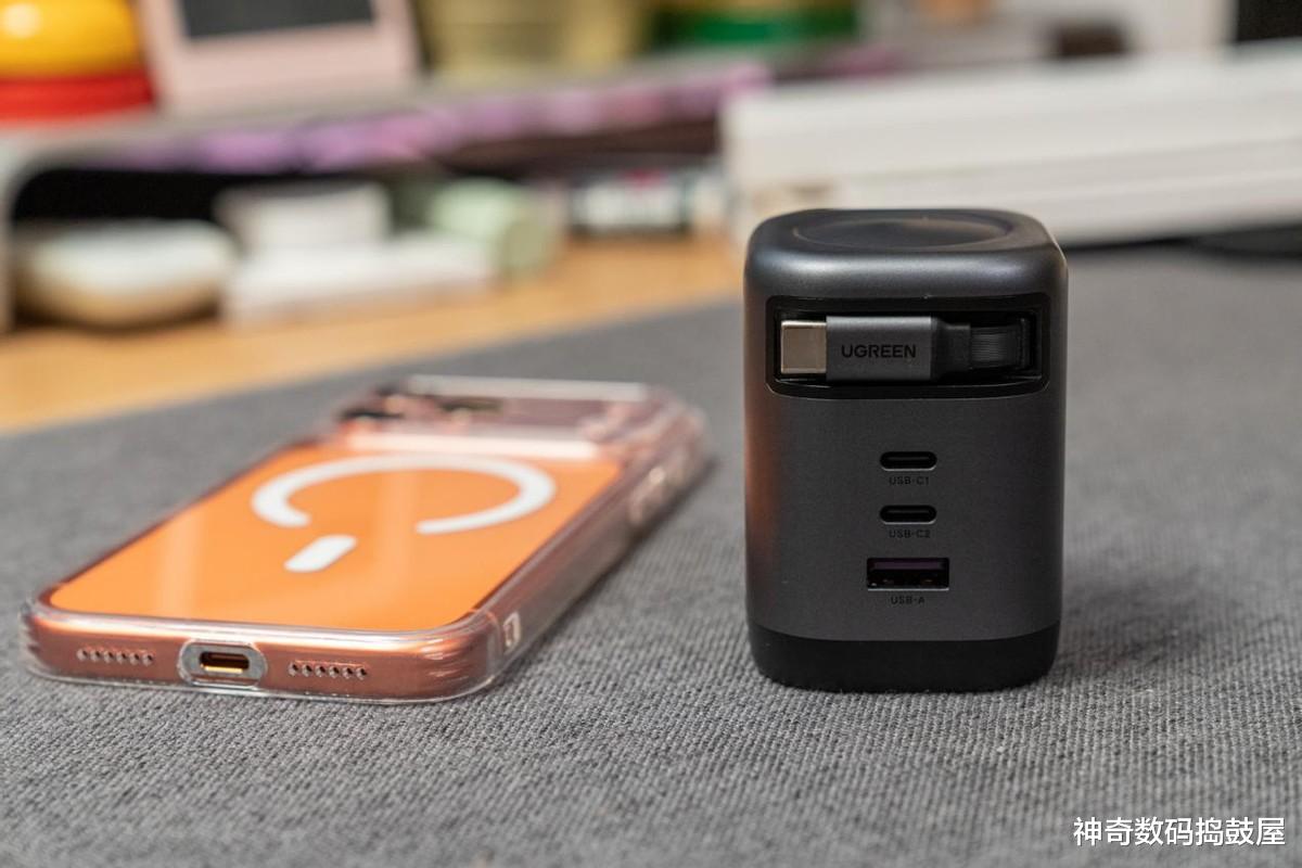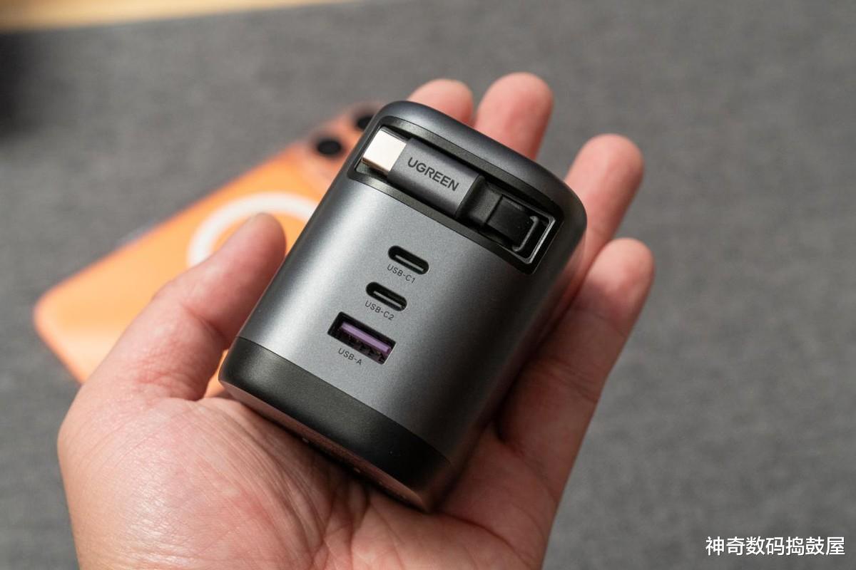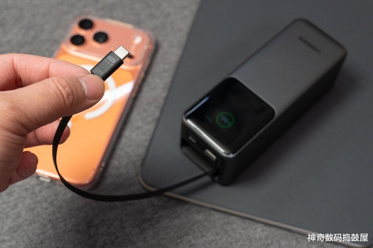 它长得还没我手掌心大,却像个小电站!最绝的是那个伸缩线设计——咔嚓一下按按钮,数据线就能自己缩回去,整整齐齐塞进充电头里!以前缠线缠到暴躁的场景没了,用完轻轻一按,瞬间“隐身”,放包里再也不怕线缠钥匙了,强迫症看了都说舒坦。