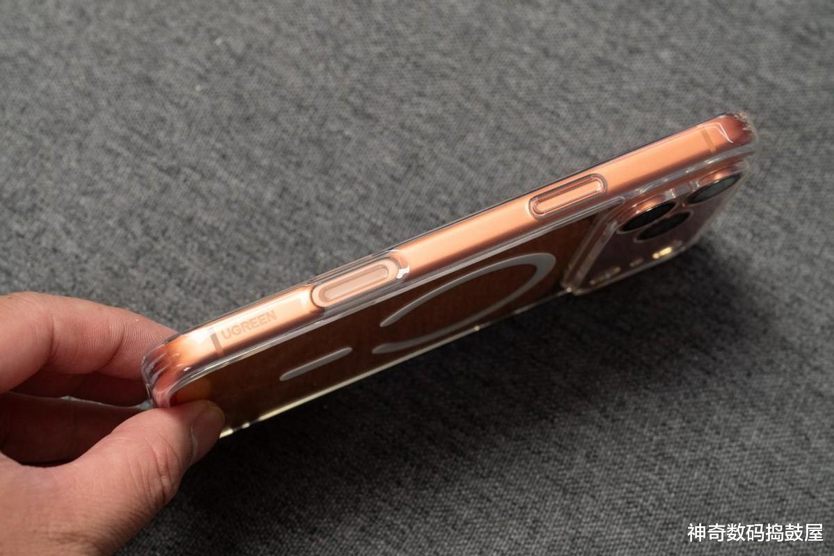 这壳子开孔真的贼准,按键按下去手感超级爽一点不硌手,然后重点啊那个iPhone专用的拍摄键它也包得严严实实,但用起来照样滑溜转圈跟裸机一样丝滑!要我说喜欢这种透亮TPU材质的,绿联这款晶透磁吸壳子真的闭眼冲,该护的都护住了,特别是iPhone 17的星宇橙色,手机本色亮出来还贼拉显!