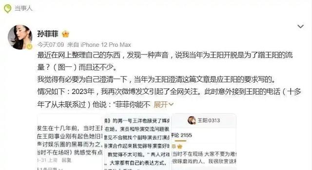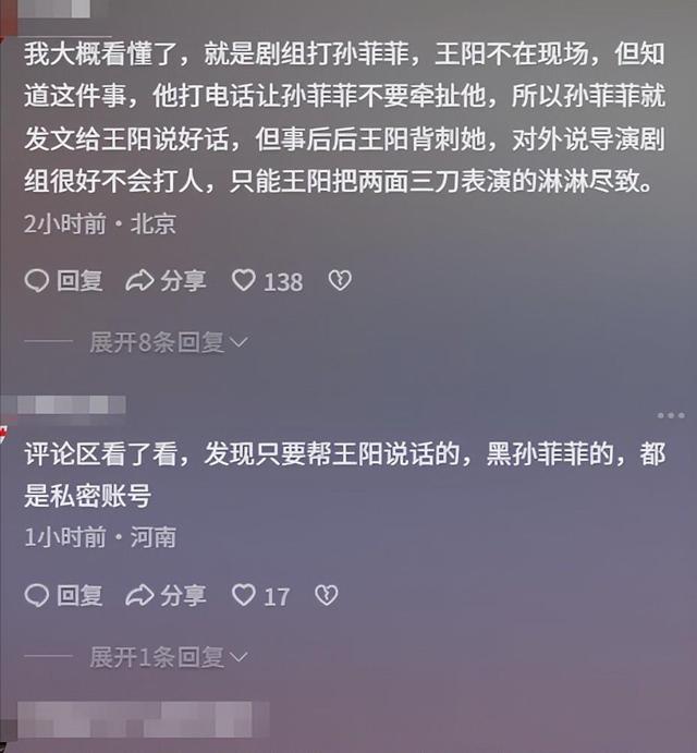 不仅如此,孙菲菲还曝出了更多当年在导演组的细节,表示王阳就是一个双面人,当面一套背后一套。