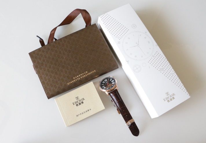 依波机械镂空真皮男表的配件算不上丰富,但也够用。