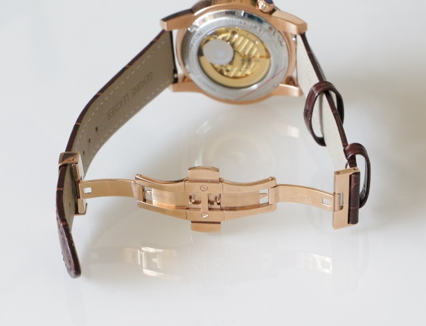 依波机械镂空真皮男表采用了时下豪华手表才有的蝴蝶扣扣紧方式,表扣颜色与表盘颜色一脉相承。