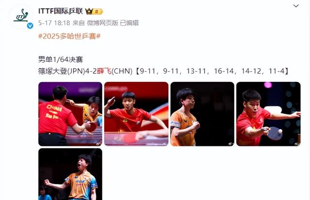 篠塚大登毕竟是登上过奥运赛场的人,比赛经验丰富,后面四局都没有再给薛飞逆转的机会,就这样薛飞成了国乒队第一个出局的人。