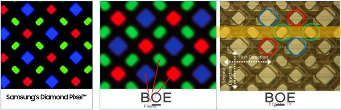 三星显示器声称,京东方的RGB OLED子像素阵列结构和它的钻石像素阵列结构类似,该结构在去年向美国德克萨斯州东区地方法院提交的诉状中作为专利侵权证据。