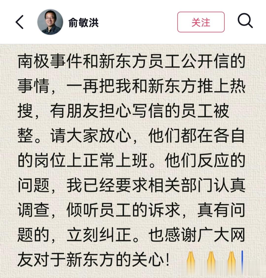 目前,俞敏洪已对两起事件做出回应,回应中他感谢了网友对新东方关注,他请大家放心,写信反映问题的员工在正常上班,他已安排相关部门认真调查,承诺有错必纠。