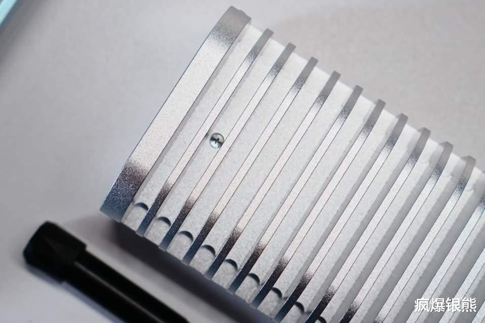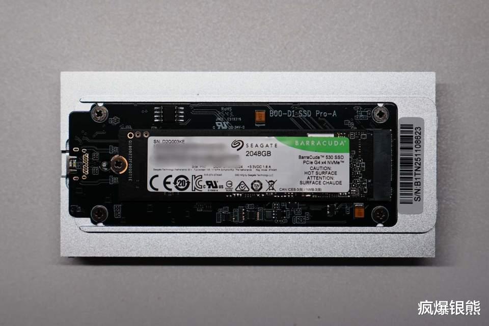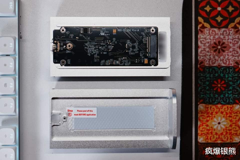 内部设计如上图,一侧是黑色PCB主板,主板上有一个2280M.2固态硬盘安装位,另一面是具有菱形花纹的高导热硅胶条。
