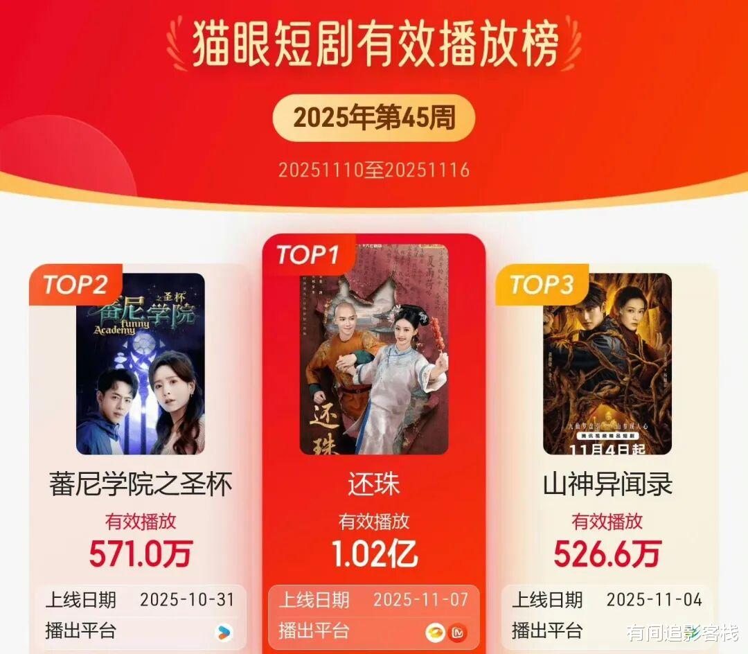 在猫眼短剧排行榜单里,《还珠》荣登第一名,播放量破1亿。