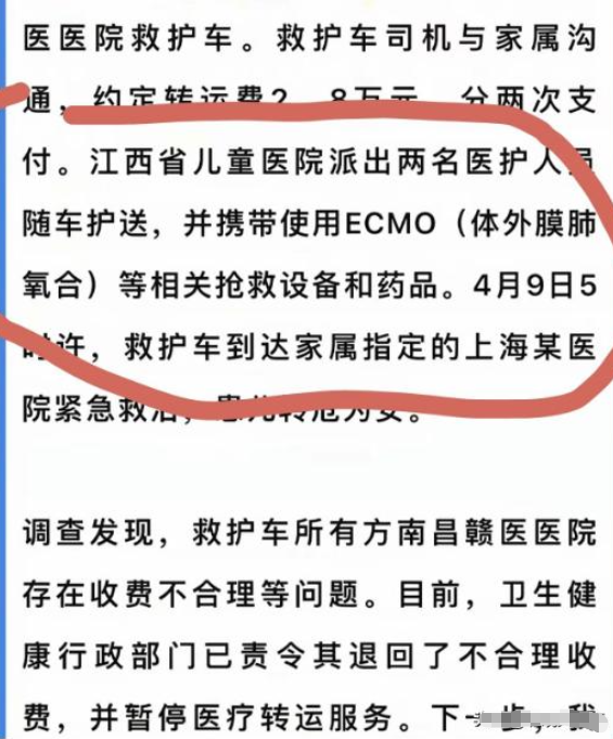 紧急转运:4月8日晚,江西南昌一名患儿病情恶化,需连夜转院至上海。由于当地医院救护车无法跨省运送ECMO(体外膜肺氧合)患者,医生帮忙联系了民营救护车。