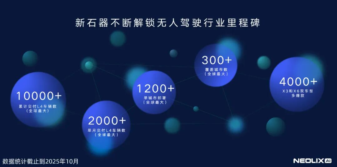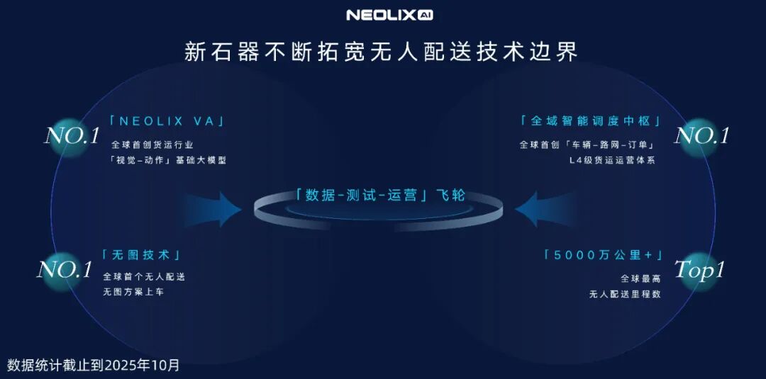 技术上:在货运领域全球首创了视觉动作基础大模型;推出首个纯无人L4级别的无图方案;针对无人车推出了全域智能调度中枢;10月突破了5000万L4级别的行驶里程数,在行业绝对领先。这些标志性的技术突破,最终支持新石器实现了“数据-测试-运营”的飞轮闭环。