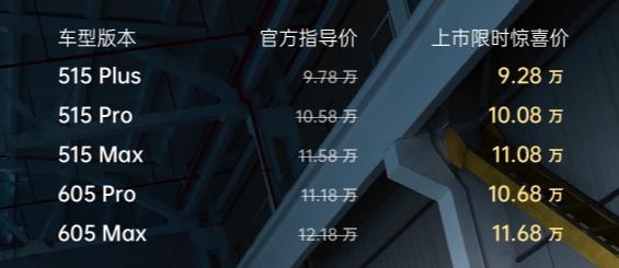 零跑Lafa5提供5款配置车型,分别为:515Plus、515Pro、515Max、605Pro、605Max,官方售价9.78-12.18万元。