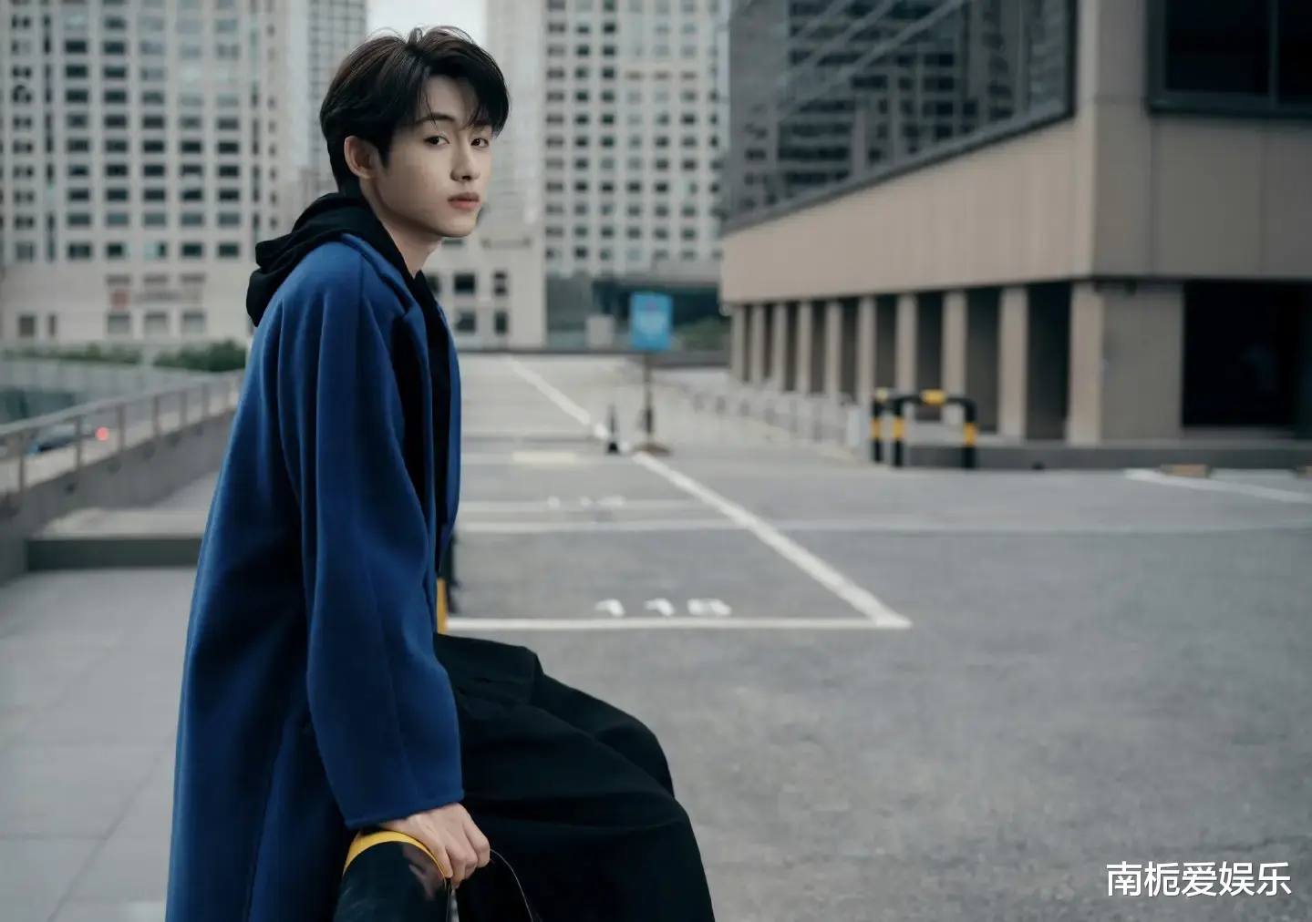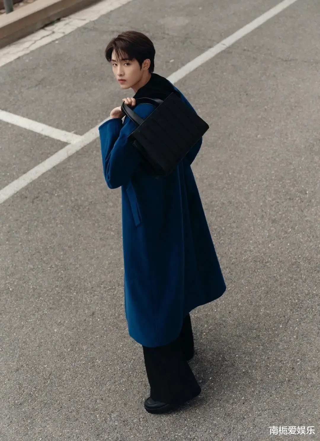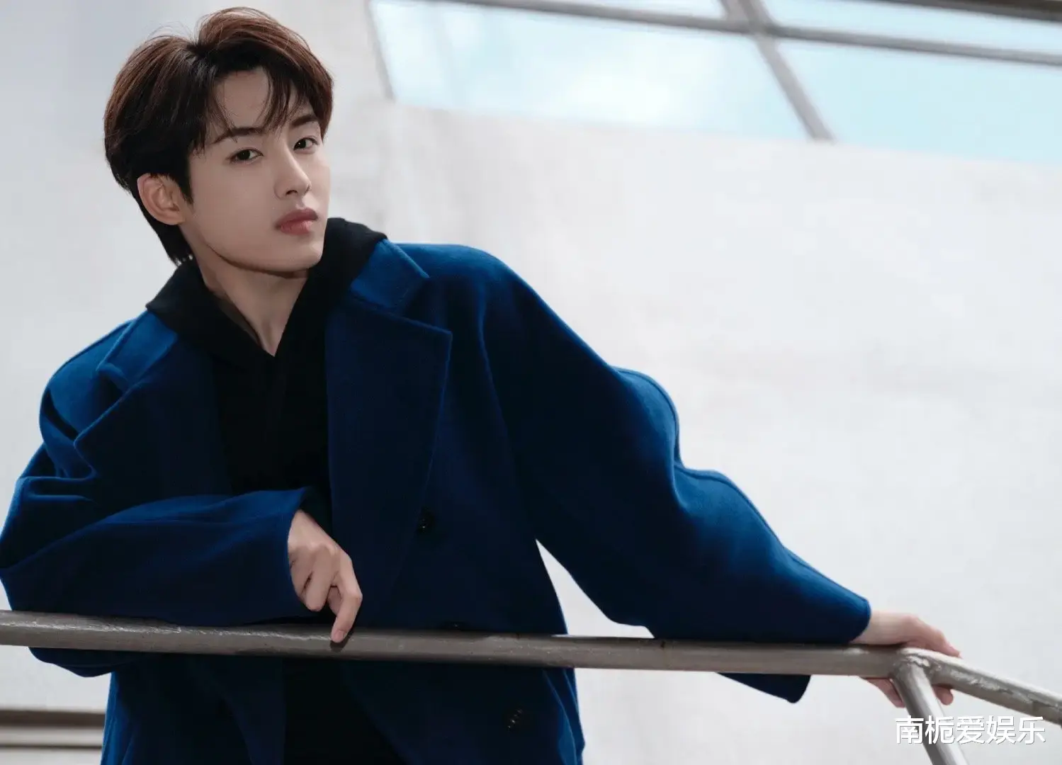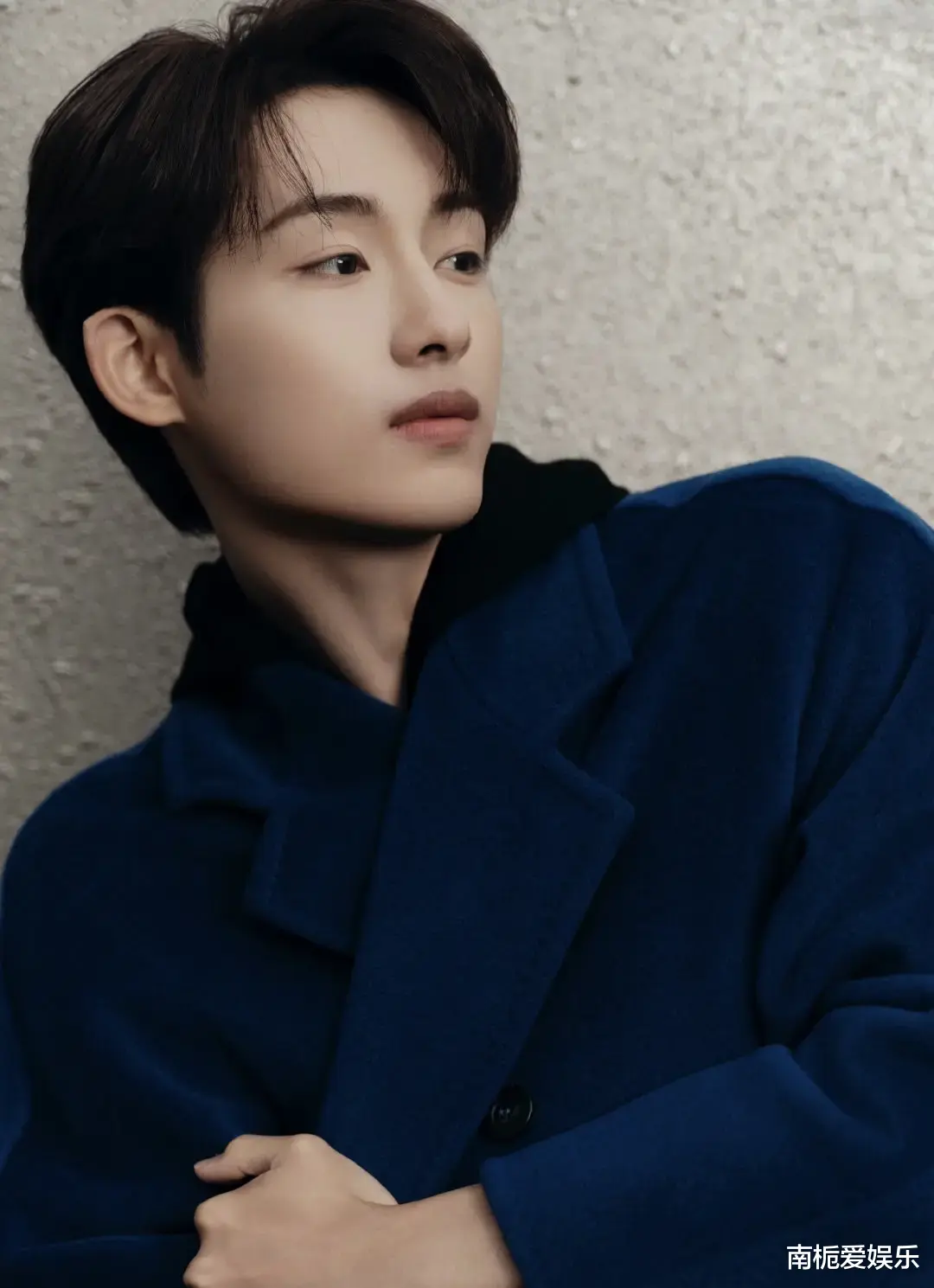 他身着一件宝蓝色廓形大衣,内搭简约黑色卫衣与利落长裤,以干净利落的穿搭风格诠释了当代摩登绅士的独特魅力。冷色调的宝蓝色大衣在灯光下泛着低调光泽,与他温暖亲和的笑容形成鲜明反差,既显贵气又不失亲和力,完美平衡了高级感与生活感。