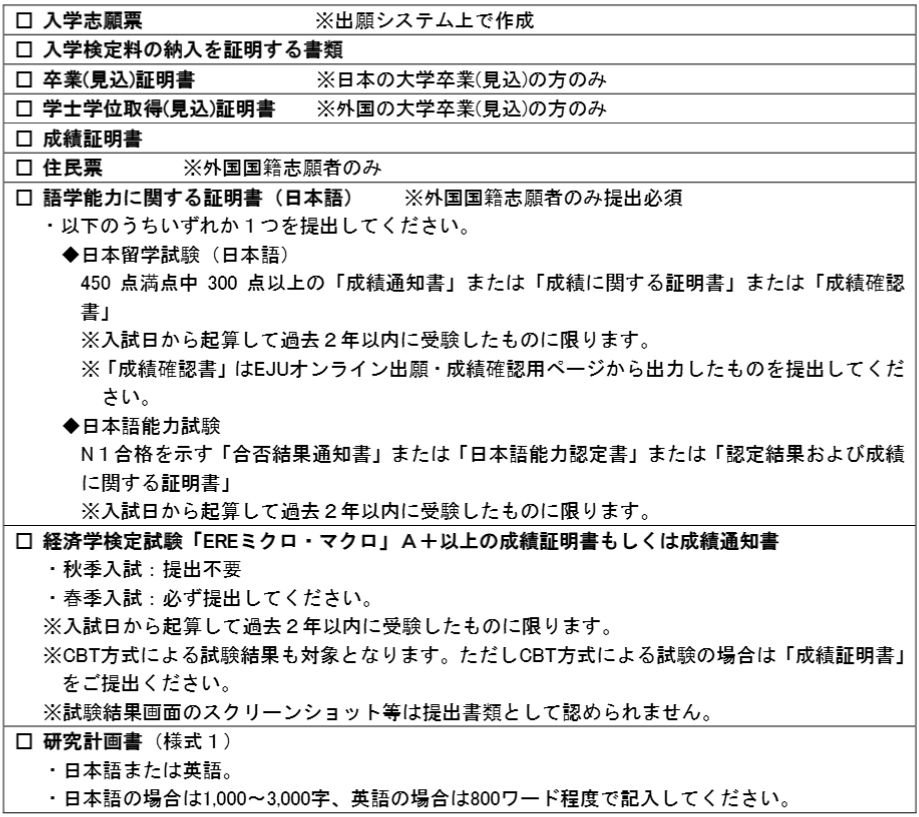 1.入学志愿票2.入学检定料支付书3.毕业(预)证明书4.学士学位取得(预)证明书5.成绩证明书6.住民票7.日语能力证明书8.经济学检定试验ERE成绩9.研究计划书
