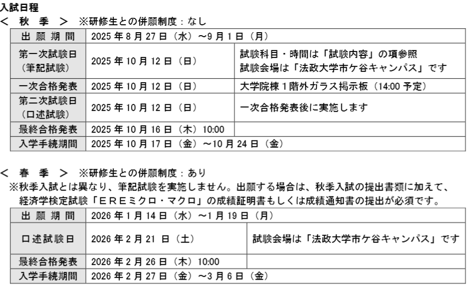 秋季入学试验出愿时间:2025年8月27日-9月1日试验日:2025年10月12日最终合格发表日:2025年10月16日入学手续时间:2025年10月17日-10月24日春季入学试验出愿时间:2026年1月14日-1月19日试验日:2026年2月21日最终合格发表日:2026年2月26日入学手续时间:2026年2月27日-3月6日经济学研究科·出愿资格