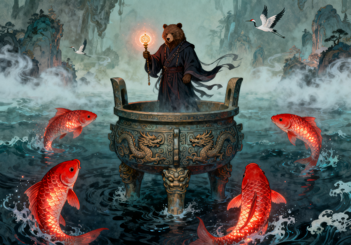 第二章 赤鲤分化:熊氏之约与千年传承时光流转,千年岁月弹指而过。沉入南海深渊的玄吃残躯,虽早已没了生息,却因深渊之下地脉灵气汇聚,加之那支星河所铸鼎足的滋养,竟未腐朽。鼎足蕴含的先天之气缓缓渗入玄吃残躯,使其骨骼血肉逐渐化为灵脉,最终分化为三条赤色鲤鱼 —— 它们继承了玄吃的真龙血脉,却因残躯灵气分布不均,灵智与修为各有差异。