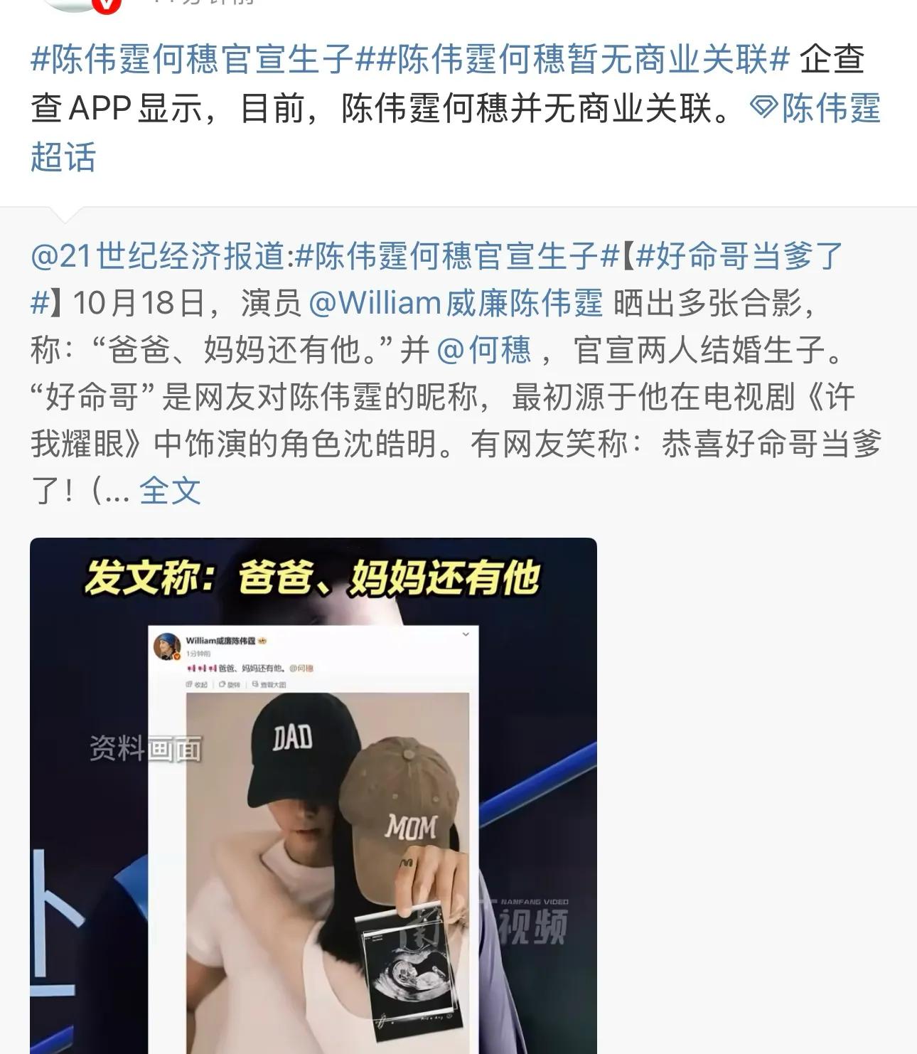 陈伟霆何穗官宣生子,二人目前无任何商业关联,男方曾与baby恋爱