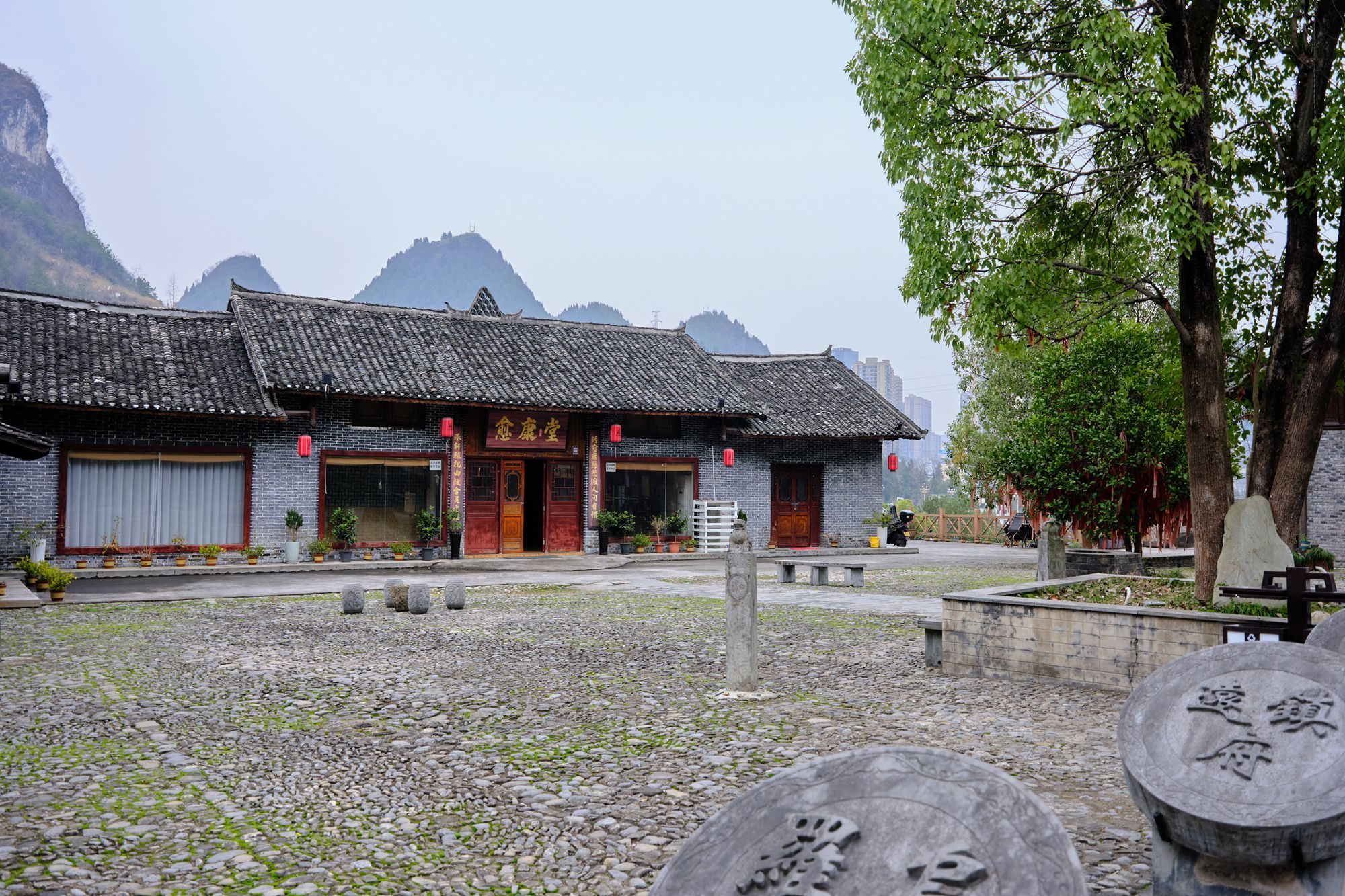 城内复原了大量明清风格的建筑和院落,青灰砖墙、木质门窗,远处喀斯特山峰为背景,随手一拍都是古韵十足的画面。走到这里不妨到中医药文化体验馆转转,了解古代医药知识、体验中医养生的魅力。