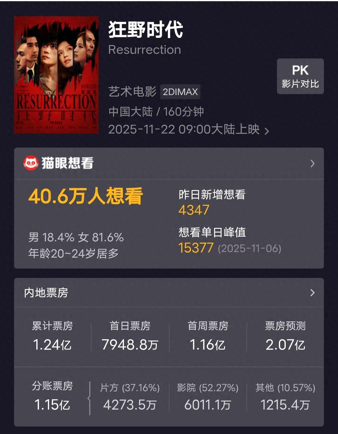 毕赣导演之前拍过《地球最后的夜晚》,当时营销“一吻跨年”,首日票房2.6亿,第二天就大跳水,被批误导观众。《狂野时代》好像又走了老路。高预售,高退票,高争议。有人直接说这是“艺术骗局”。