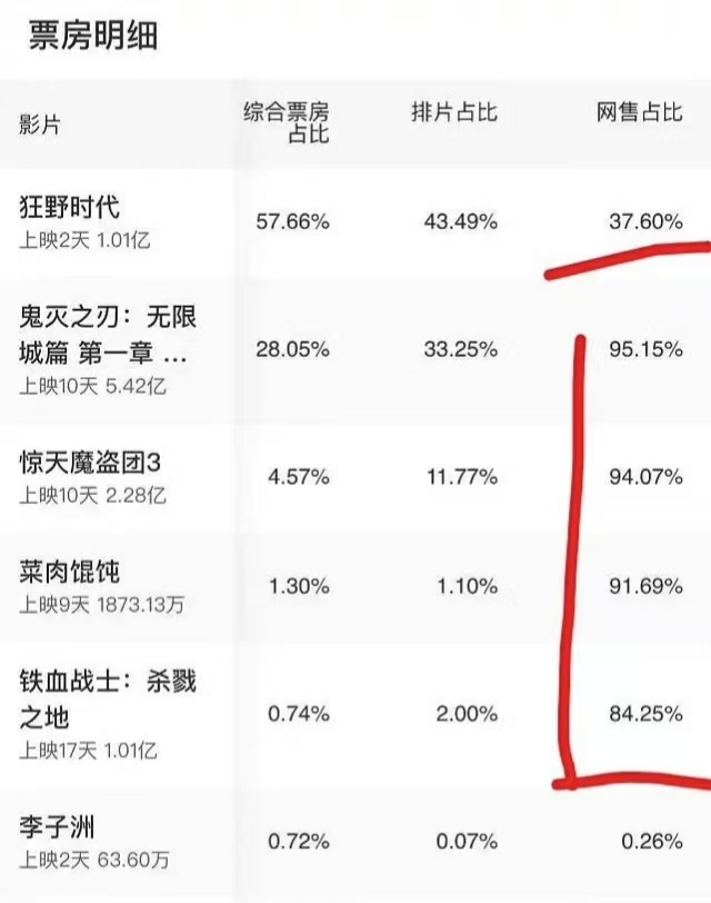 更奇怪的是线上购票比例,只有37%,远低于商业片通常80%以上的水平。甚至有个别时间段,这个比例跌到了16.7%。这让人怀疑是不是有很多线下包场或者“幽灵场”在撑排片。虽然片方没明确回应,但这种数据看起来确实不寻常。