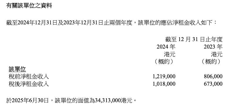 截至2025年6月末,标的物业估值为3431.3万港元,2024年度税后净租金收入101.8万港元,相较于2023年度的67.3万港元同比增幅达51%,当前处于空置状态。