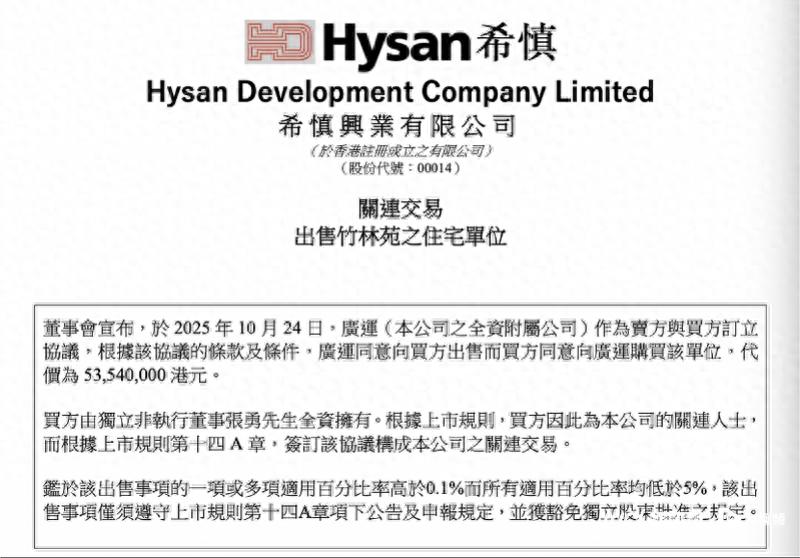 据公告,此次交易的竹林苑为希慎集团发展的住宅项目,位于香港半山坚尼道地的黄金地段。该项目由6座住宅大楼组成,共有345个住宅单位及436个停车位。竹林苑由希慎集团持有作租赁用途。自2025年8月起,希慎集团已分阶段出售竹林苑两座住宅大楼的住宅单位及部分停车位。