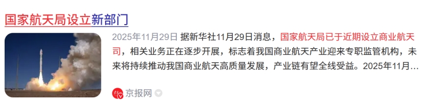 2025年11月29日消息,国家航天局设立商业航天司,相关业务正在逐步开展,标志着我国商业航天产业迎来专职监管机构。