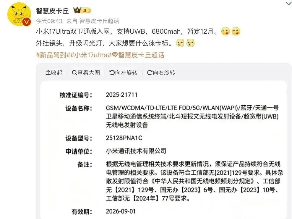与此同时,博主@智慧皮卡丘 爆料也显示其为小米17 Ultra双卫通版,支持UWB,内置6800mAh电池,还有外挂镜头,并升级闪光灯。