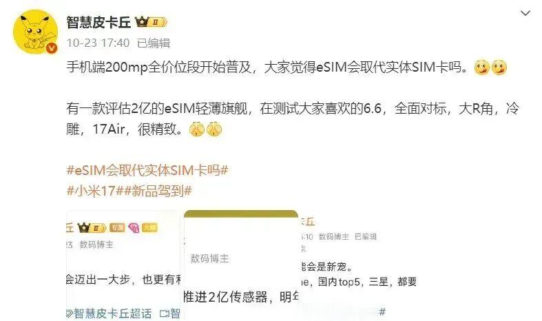此前,博主@智慧皮卡丘 曾爆料称,小米正在评估一款2亿像素镜头、搭载eSIM技术的轻薄旗舰项目,预计命名为小米17 Air。