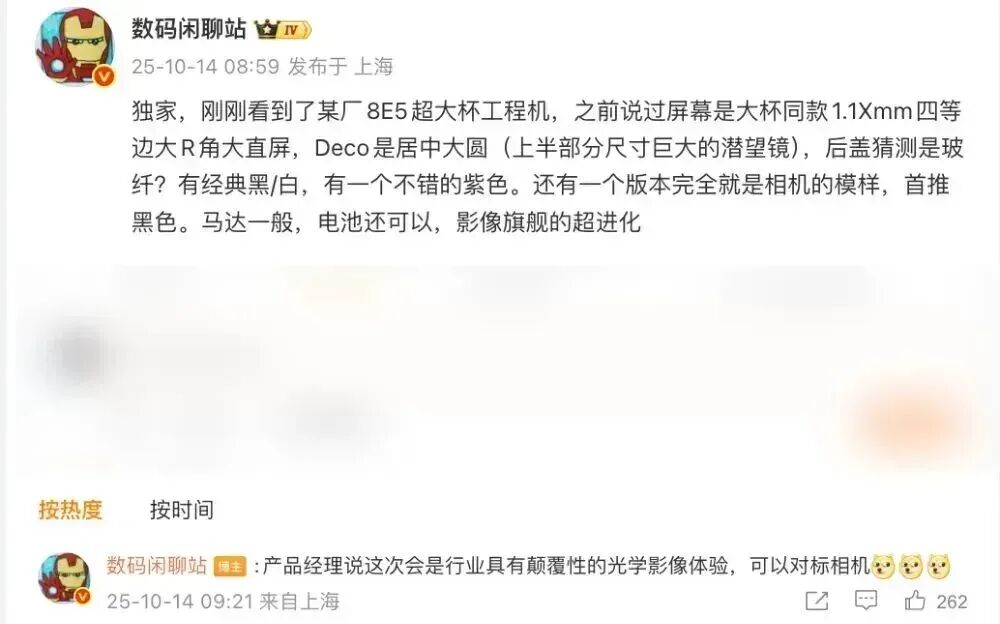 这位博主还表示“产品经理说这次会是行业具有颠覆性的光学影像体验,可以对标相机”。