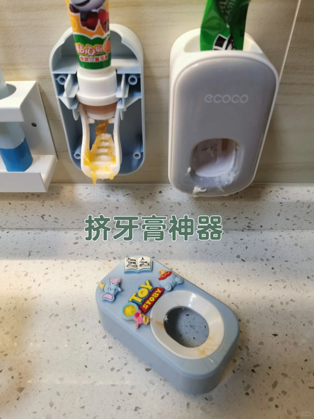 一切都是想象般美好,可等你买回家就会又又又掉坑里了。电动的挤牙膏神器,无论你是怎么放牙刷,它总是像特意避开牙刷一样,怎么都落不到牙刷上面。