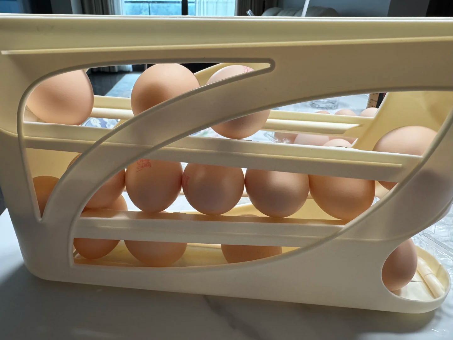 不得不说,现在的商家真是“太聪明”了,装鸡蛋居然还可以这样玩儿。号称特别省空间,而且用起来特别顺手的鸡蛋收纳架,还是滚动式的。
