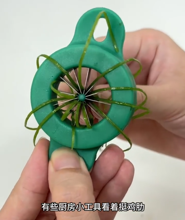 它的工作原理就是把葱放在切葱神器最中间的位置,然后往上一拉,就可以把葱切成葱丝儿。