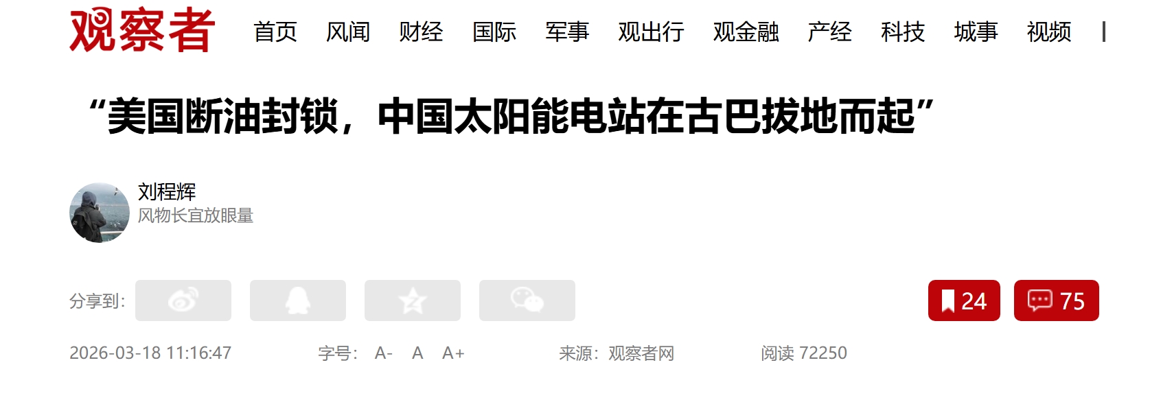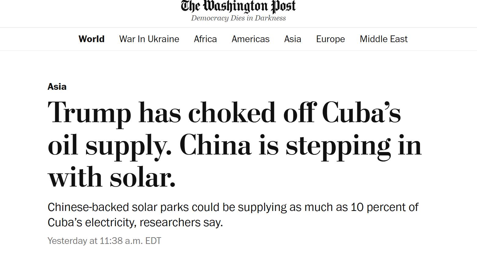 这件事显然让美国有些着“急了”,包括《华盛顿邮报》、“美国有线电视新闻网(CNN)”等主流媒体最近两天密集、深度的报道此事。《华盛顿邮报》甚至以“特朗普正切断古巴的石油供应,而中国正通过太阳能介入”为题,指出美国对于古巴的最重要的制裁手段恐将面临失效。
