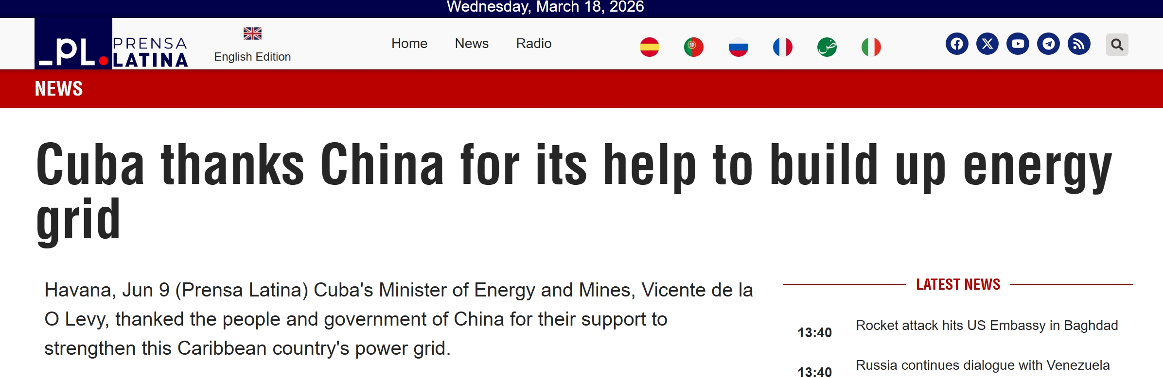 对此,据“拉美通讯社”此前的报道(见上图),古巴能源与矿业部长文森特·德拉奥·莱维专门感谢中国人民和政府对于古巴电网建设的帮助和支持。