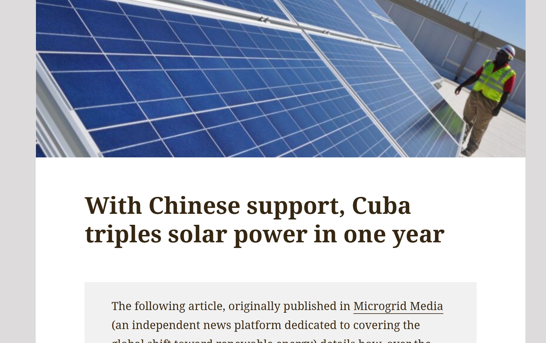 中国在这一过程中扮演的角色,不仅是设备供应商,更是技术和融资的提供者。据外媒《FSC》报道(见下图),中国向古巴提供了包括光伏组件、电站建设、技术培训以及金融支持在内的一整套解决方案。这种“打包式合作”使古巴能够在短时间内完成从无到有的跨越,而不需要经历漫长的技术积累过程。