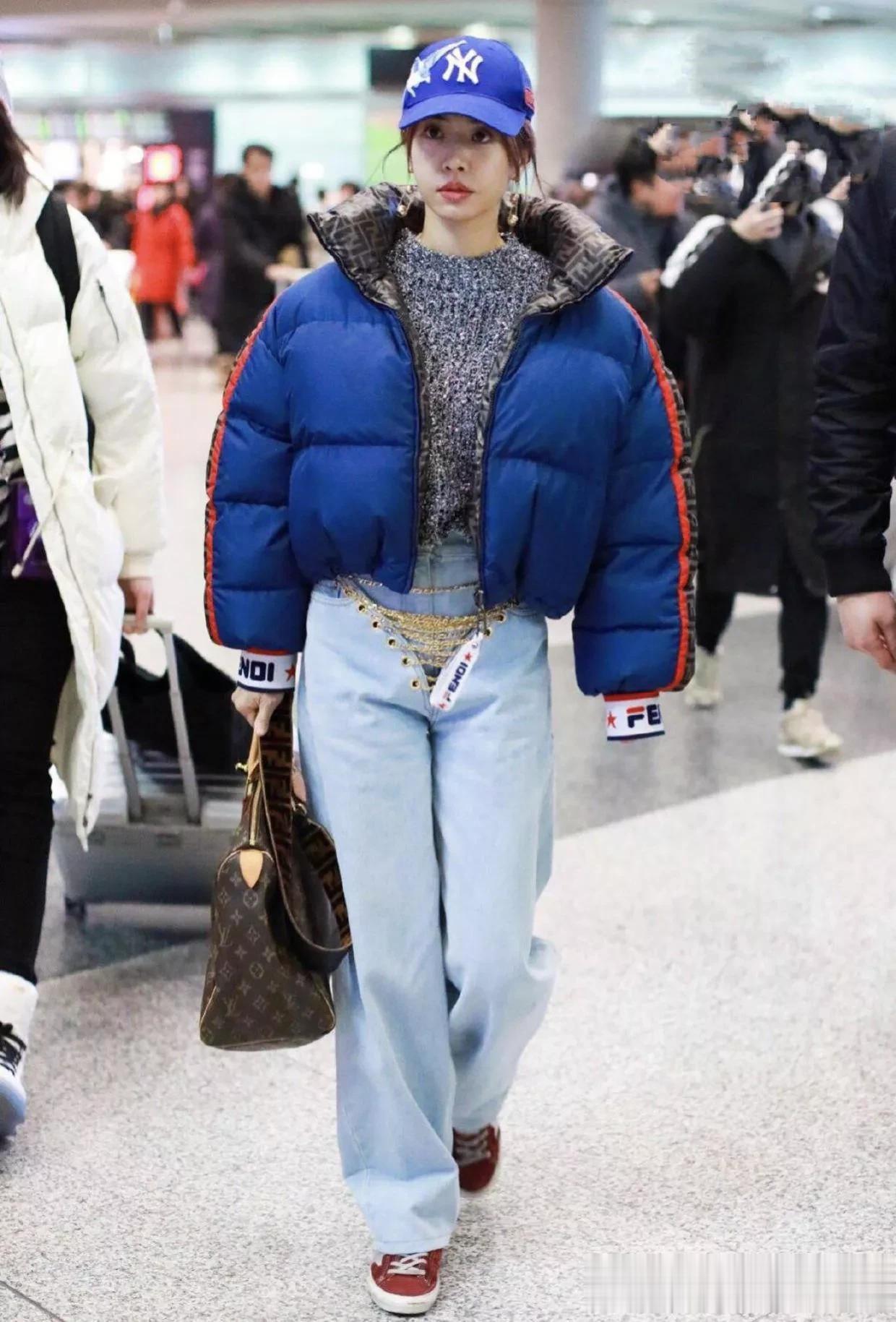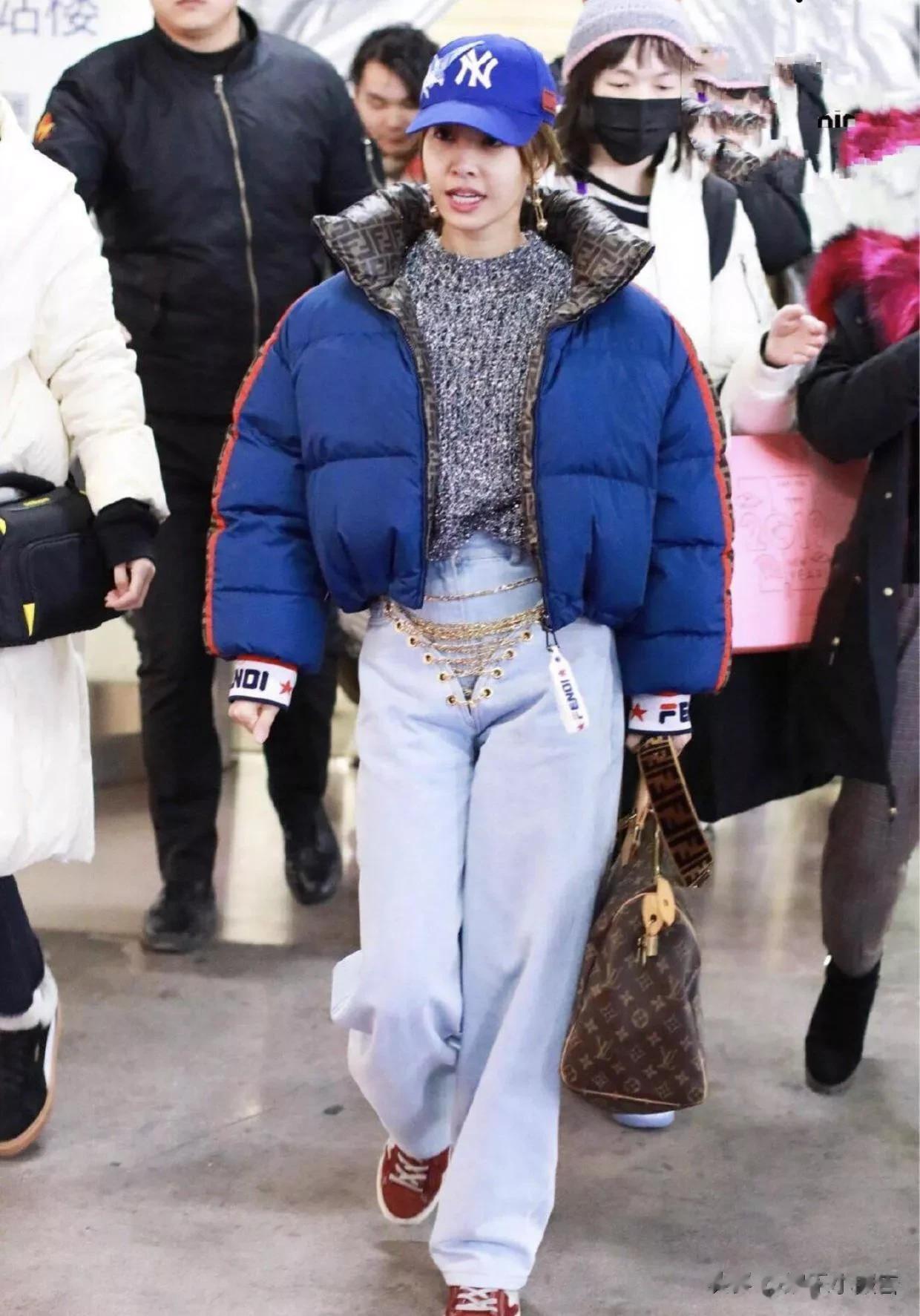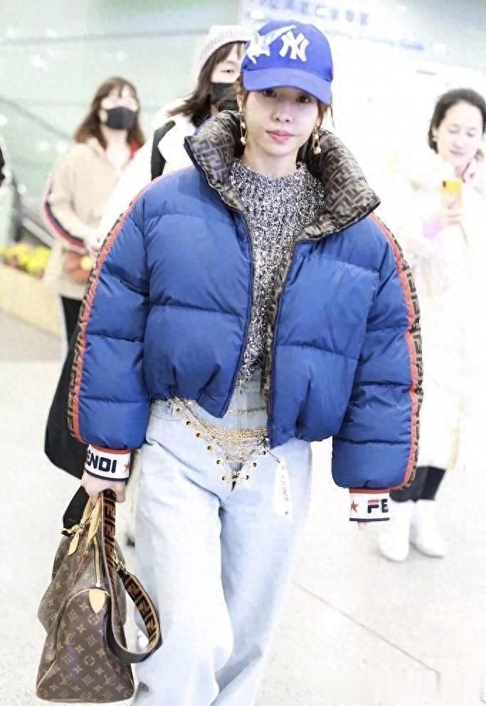 蔡依林蓝羽绒服配棒球帽,轻松美出国际范
