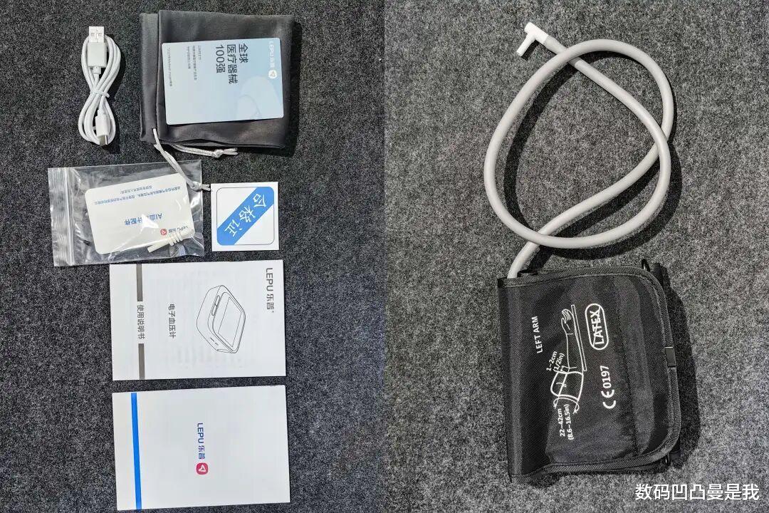 打开包装,除了血压计主机外,还有袖带、充电线、收纳袋、说明书和使用指南等。