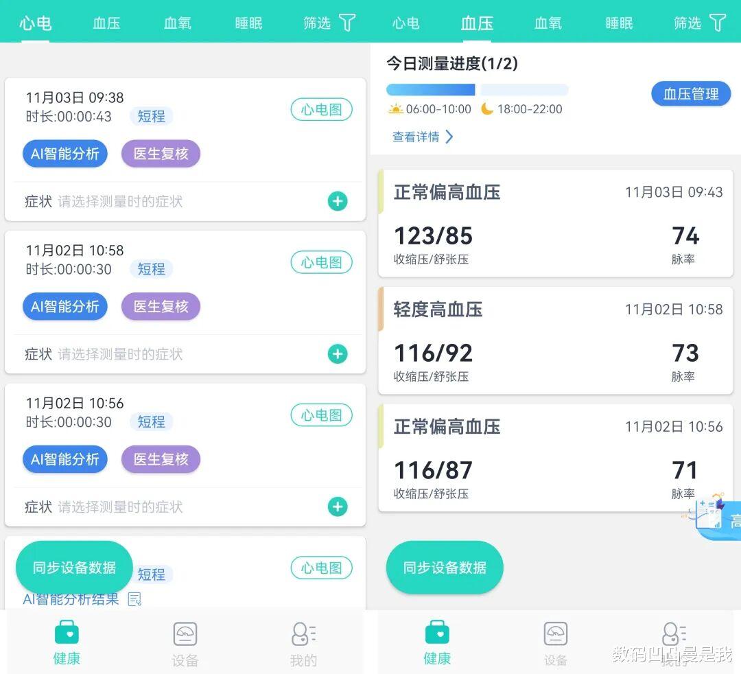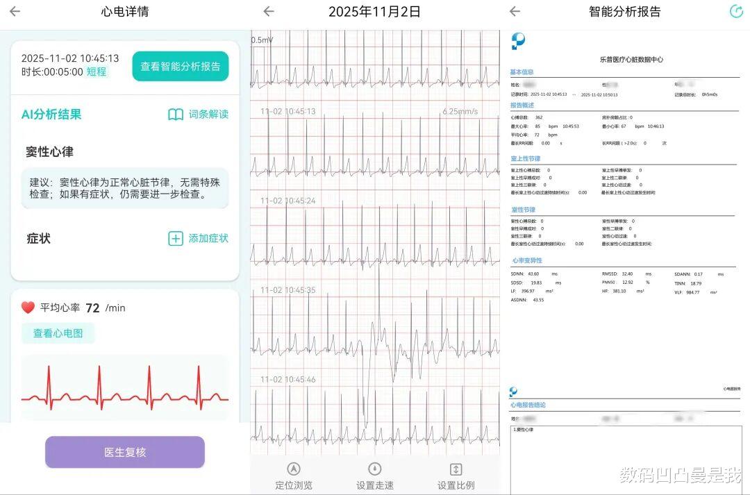 测量最快30秒,也可选择最长5分钟的测量记录更完整的波形。测量完成后会进行AI智能分析,提供包括心率、心律类型等的报告。如果检测到的异常情况,如房颤、室性早搏等,设备也会给出提示。