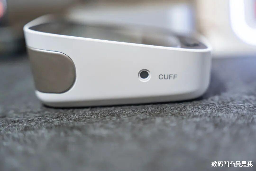 机身背面两侧配备了大面积金属极片,这是心电测量的电极。主机左侧的CUFF圆孔用于连接血压袖带的气管,中间有一个按键,用来绑定和创建用户。