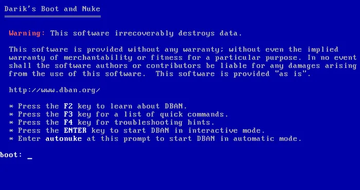 对于使用传统硬盘驱动器 (HDD) 的用户来说, DBAN (Darik's Boot and Nuke)是一款高度安全且独立的实用程序。但是,不建议将 DBAN 用于固态硬盘 (SSD)。对于 SSD,最好使用制造商提供的“安全擦除”实用程序,以避免对硬盘造成不必要的损耗。