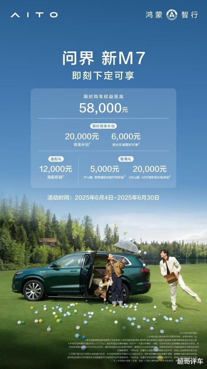 问界 新M7在展现卓越产品力的同时,更以超值购车权益展现满满诚意,购车可享至高58000元权益,包括26000元现金补贴(含:部分地区限时6000元补贴)、12000元选配金以及智驾升级权益等,让这款“家用智慧SUV”成为暑期出行的超值之选。