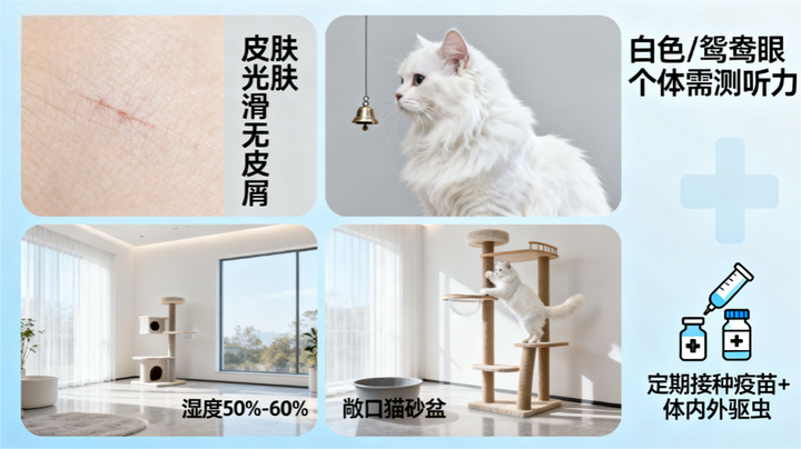 预防措施:选购白色个体时需排查听力状况,成年后每年进行皮肤检查与听力测试;每月体外驱虫,每季度体内驱虫,定期接种猫三联与狂犬病疫苗;老年猫(10 岁以上)需每半年体检一次,重点排查肾功能与关节健康。