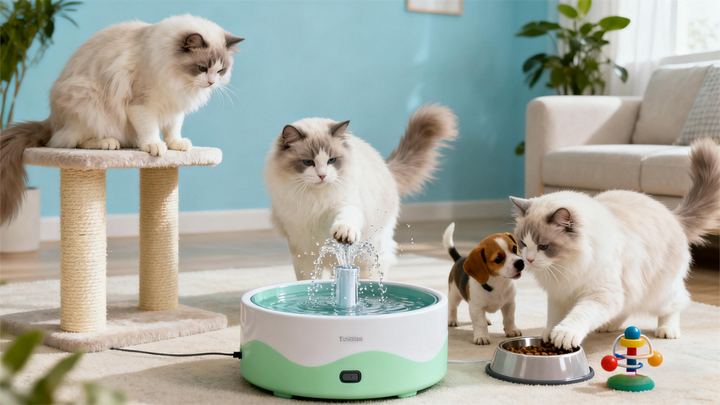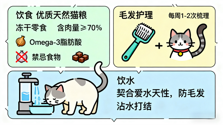 喂食技巧:采用 “少食多餐” 模式,成年猫每日喂食 3 次,每次食量约 40-60 克,避免过量喂食导致肥胖;提供充足清洁饮水,建议使用流动饮水机,契合其爱水天性,同时减少毛发沾水打结风险。