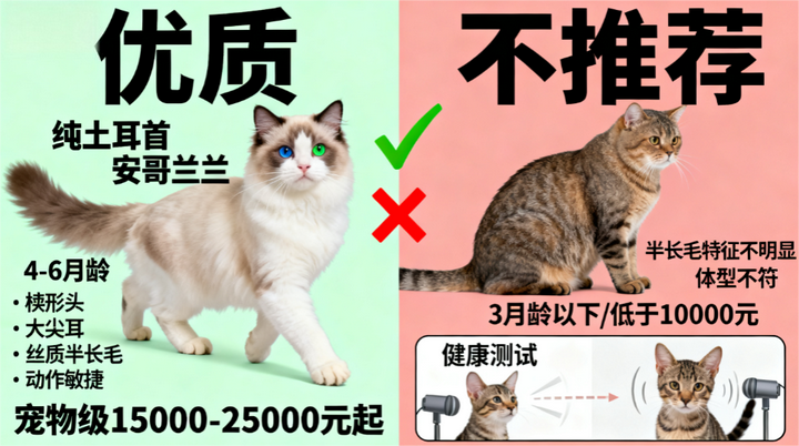 年龄选择:4-6 月龄最佳,此时半长毛特征已显现,体型基本定型,且已完成基础疫苗接种;避免购买 3 月龄以下幼猫,其毛发与体型尚未发育成熟,难以判断纯度。