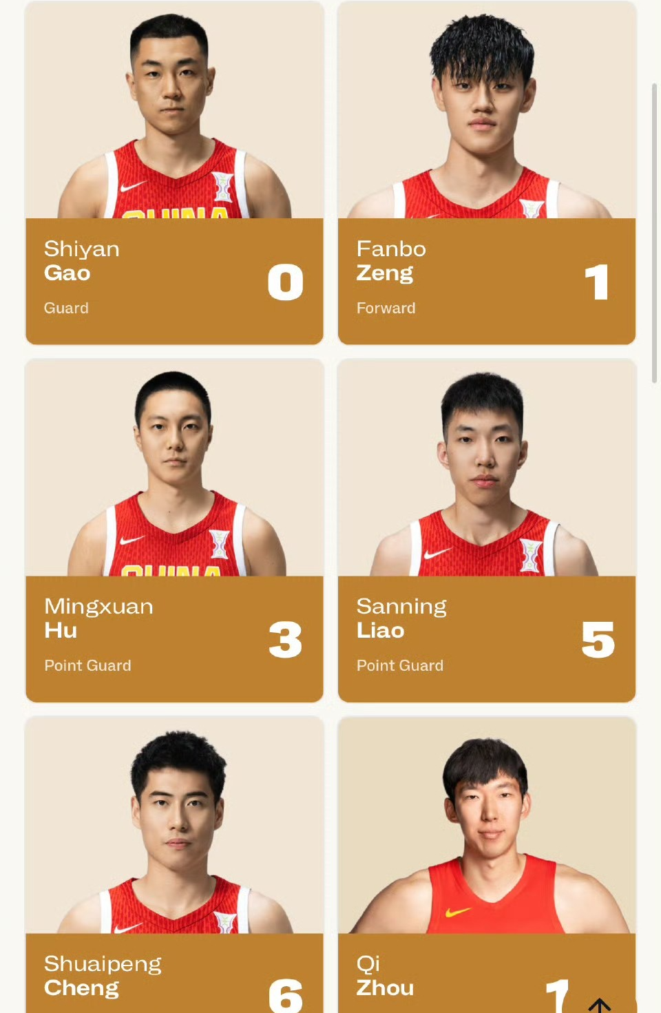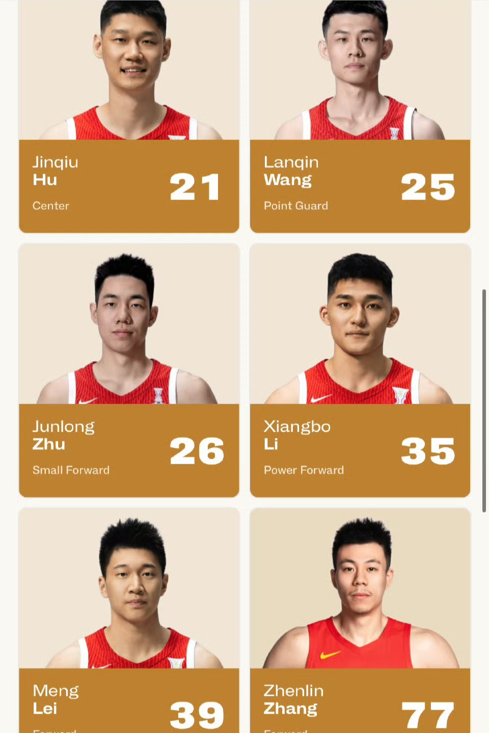 中国男篮确认本场比赛运动员名单为:后卫线:高诗岩、王岚嵚、胡明轩、廖三宁、程帅澎。