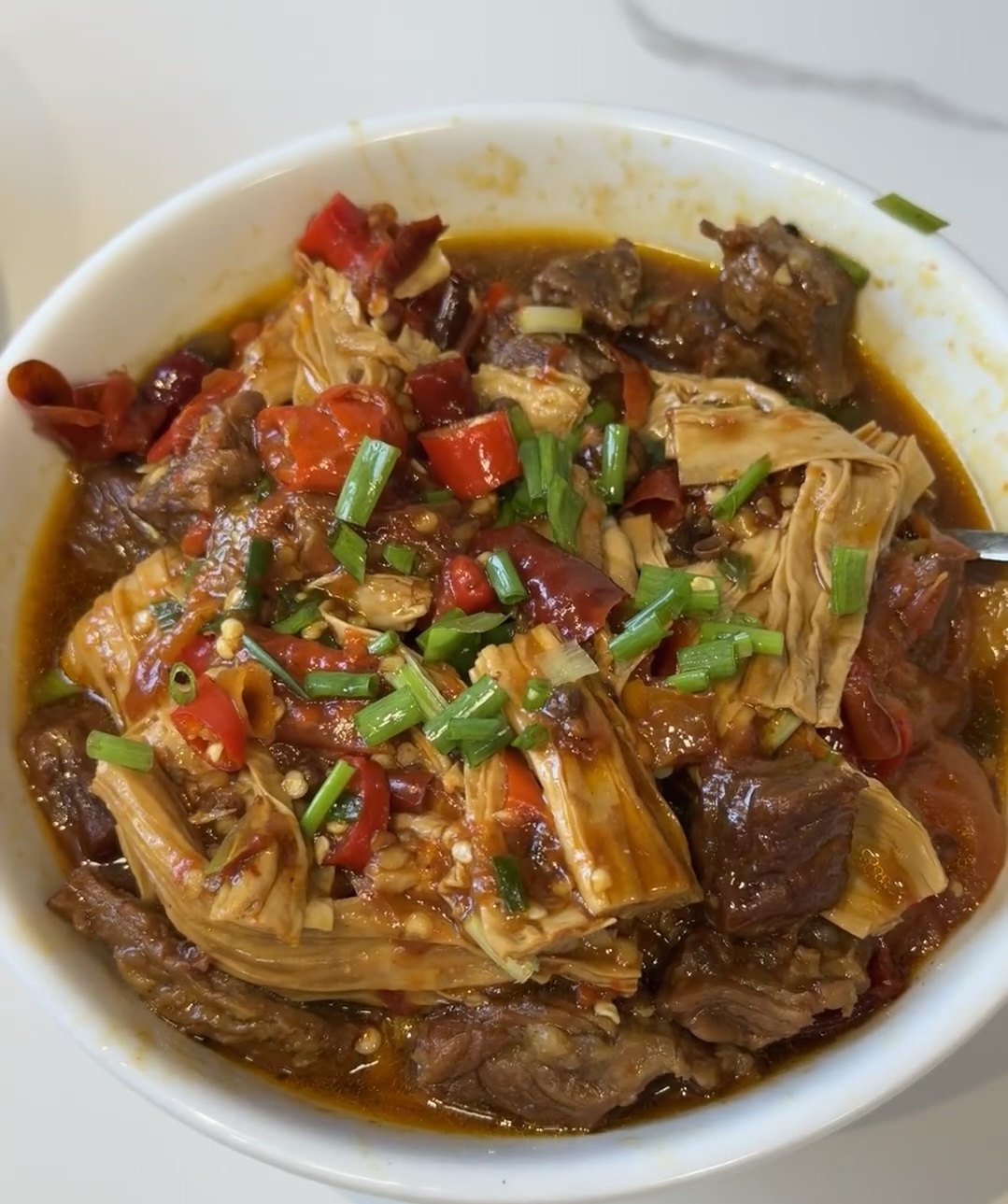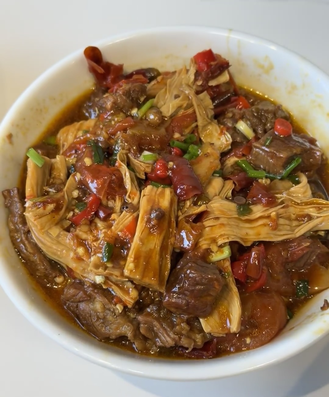 6.收汁装盘:打开锅盖,转大火收汁,待汤汁变得浓稠后,即可关火。将牛肉烧腐竹盛出,撒上少许葱花点缀,一道美味的牛肉烧腐竹就做好了。