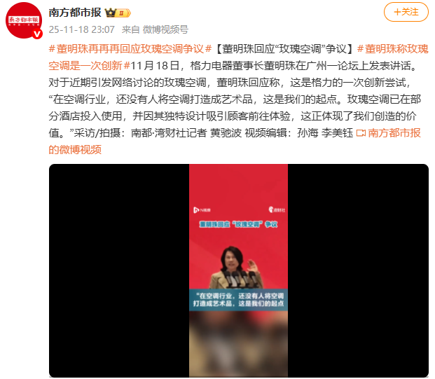 2025年11月19日消息,据南方都市报,近日,格力电器董事长董明珠出席第二十届中国经济论坛,对于玫瑰空调引发网络热议,她表示,这(玫瑰空调)是格力的一次创新尝试,在空调行业,还没有人将空调打造成艺术品,这是我们(格力空调)的起点。