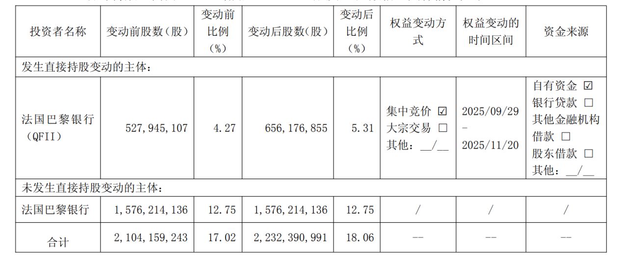 增持后,法国巴黎银行及法国巴黎银行(QFII)合计持股比例由17.02%增加至18.06%。