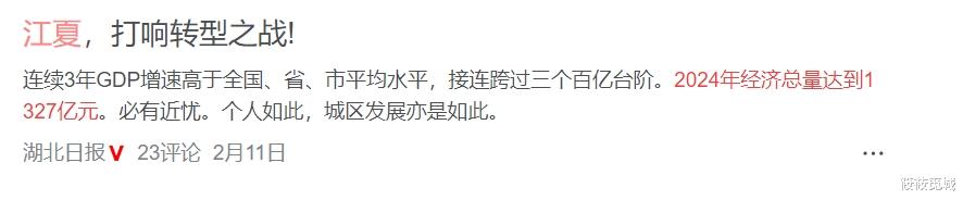 而江夏这边的数据也有变动,去年12月底相关新闻说江夏预计是1260亿,但是1月份又传出江夏突破1300亿大关,2024年经济总量达到1327亿元,排名全市第七。而这一信息也在湖北日报相关自媒体平台报道过。