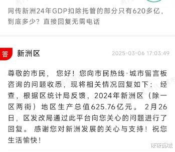然后新洲这边先是电话回复了,然后在3月6号正式在留言板上回复了,新洲区(除一区两街)地区生产总值625.76亿。和其官方公布的数据一致。