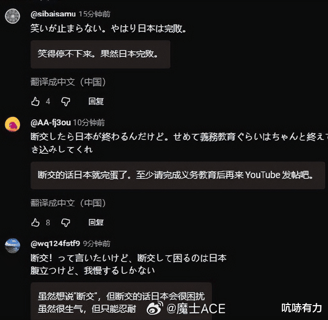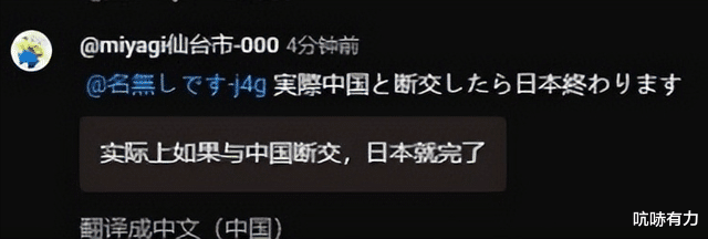 “实际上如果和中国断交,日本就完了,请至少完成义务教育再来发帖吧。”